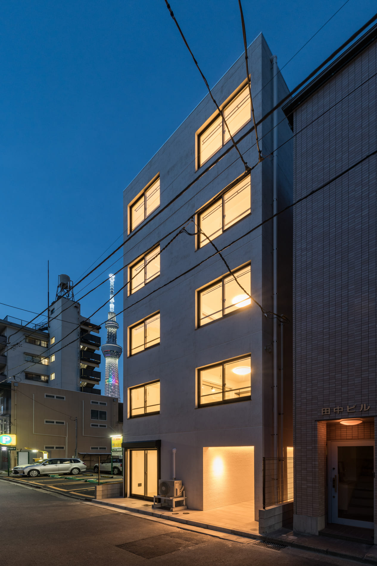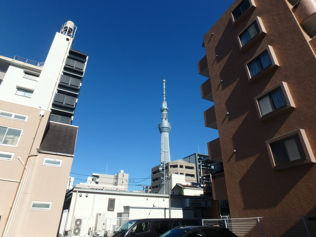 白を基調としたシンプルな外観と、上階から望むスカイツリーの景観が、都心生活にさりげない潤いを添えます。